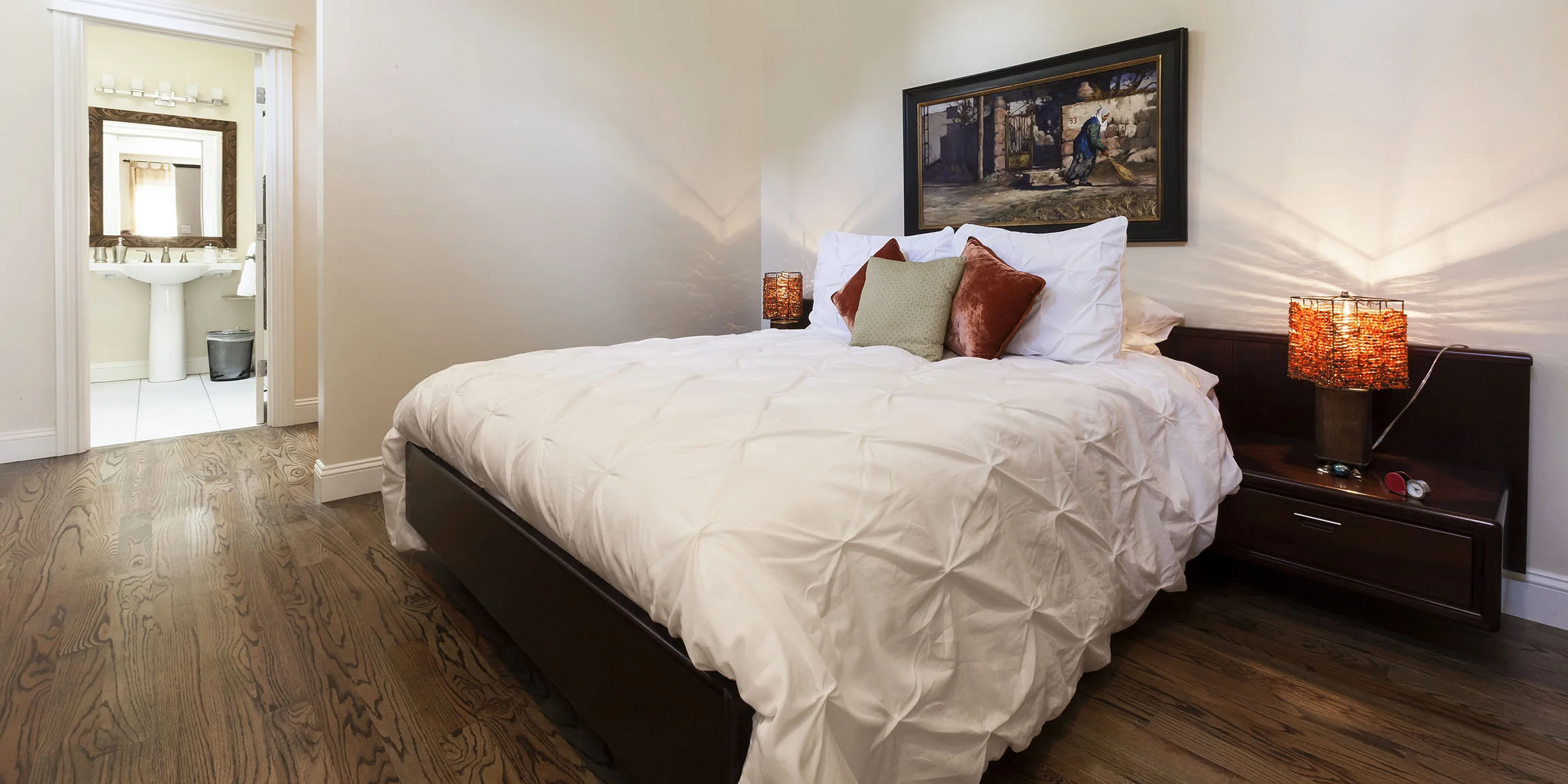 Élan’s Portofino suite offers 660 square feet of living space, a full private bath, accouterments and pillow-top queen bed with luxurious linens. Earth toned and gauze panels filter natural light from south facing windows and private balcony door. High ceilings enhance fine musical acoustics. Clean lines, rich textures, contemporary furnishings, hardwood floors, and pewter accents punctuate a sublime interior.